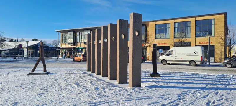 Ved Humlebæk Station står Erik Heides skulpturgruppe Den stående, Søjlerne og Den gående. Værkerne er udført i Heides karakteristiske grove materialer og enkle former, som kendetegner meget af hans kunst.